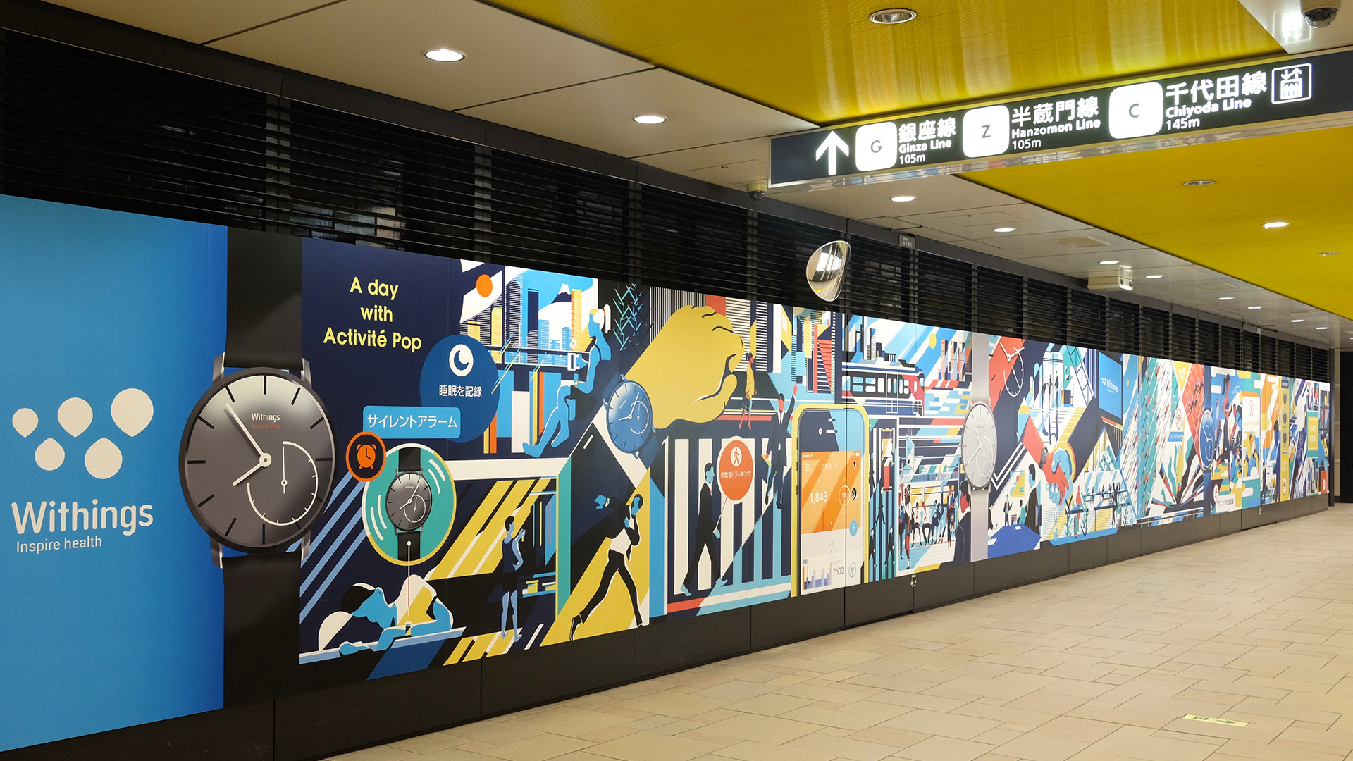 Later this year, for the launch of the long-awaited Withings Activite Pop, a smart watch combining design and activity tracking, we proceed to jack a 30 meter wall in the Omotesando station, home to Tokyo’s latest trends, in order to present an original mural of “A day with Pop”.